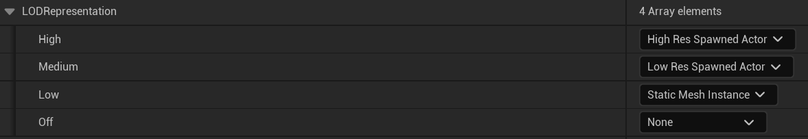 Inside Params you can set what visualization you want to use inside LODRepresentation. For example when the player is close the High Res Actor is used, when it goes far away it will use the Static Meshes and when very far nothing will be used.